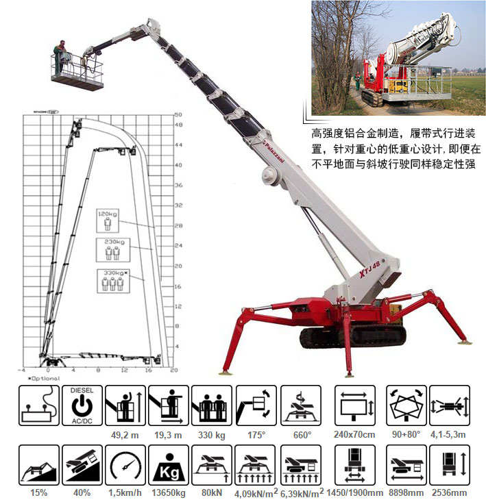 · XTJ48.1蜘蛛式登高车最大行车时速为2.25公里,爬坡能力为25%。